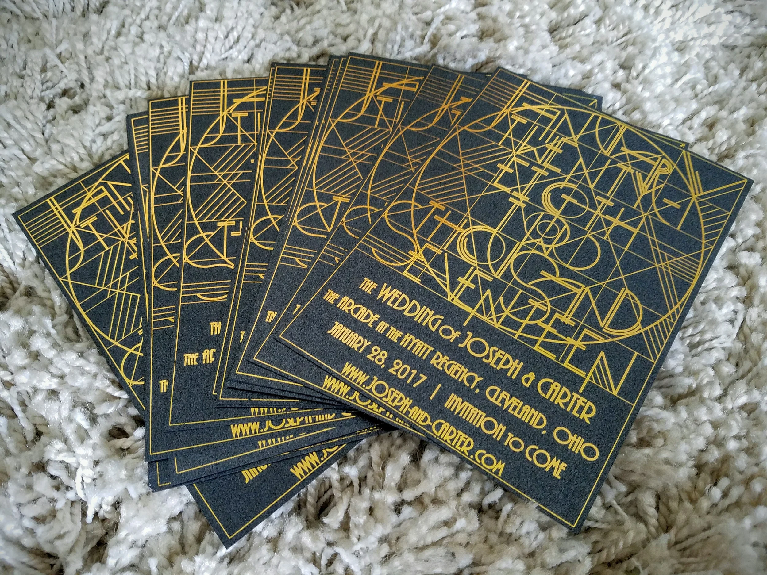 I drafted up a few designs in Adobe Illustrator and ordered a bunch of paper samples from PaperandMore.com. We ultimately decided on a linear art deco style and found a super easy way to apply the gold foil ourselves using a cheap laminator and some gold toner-reactive foil.